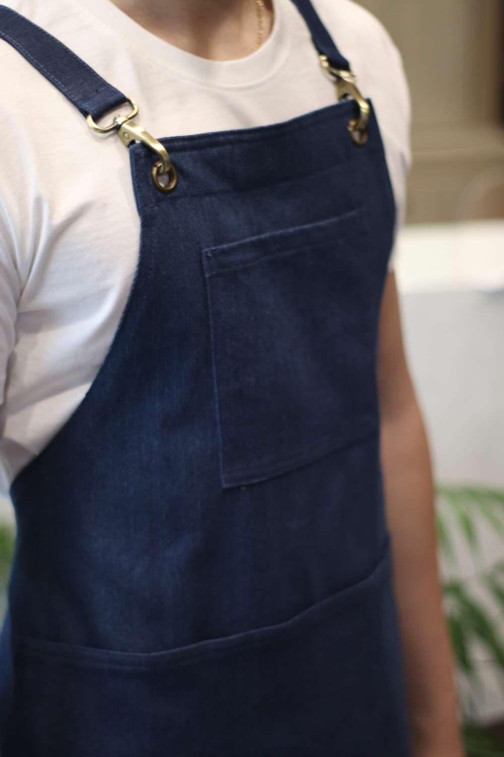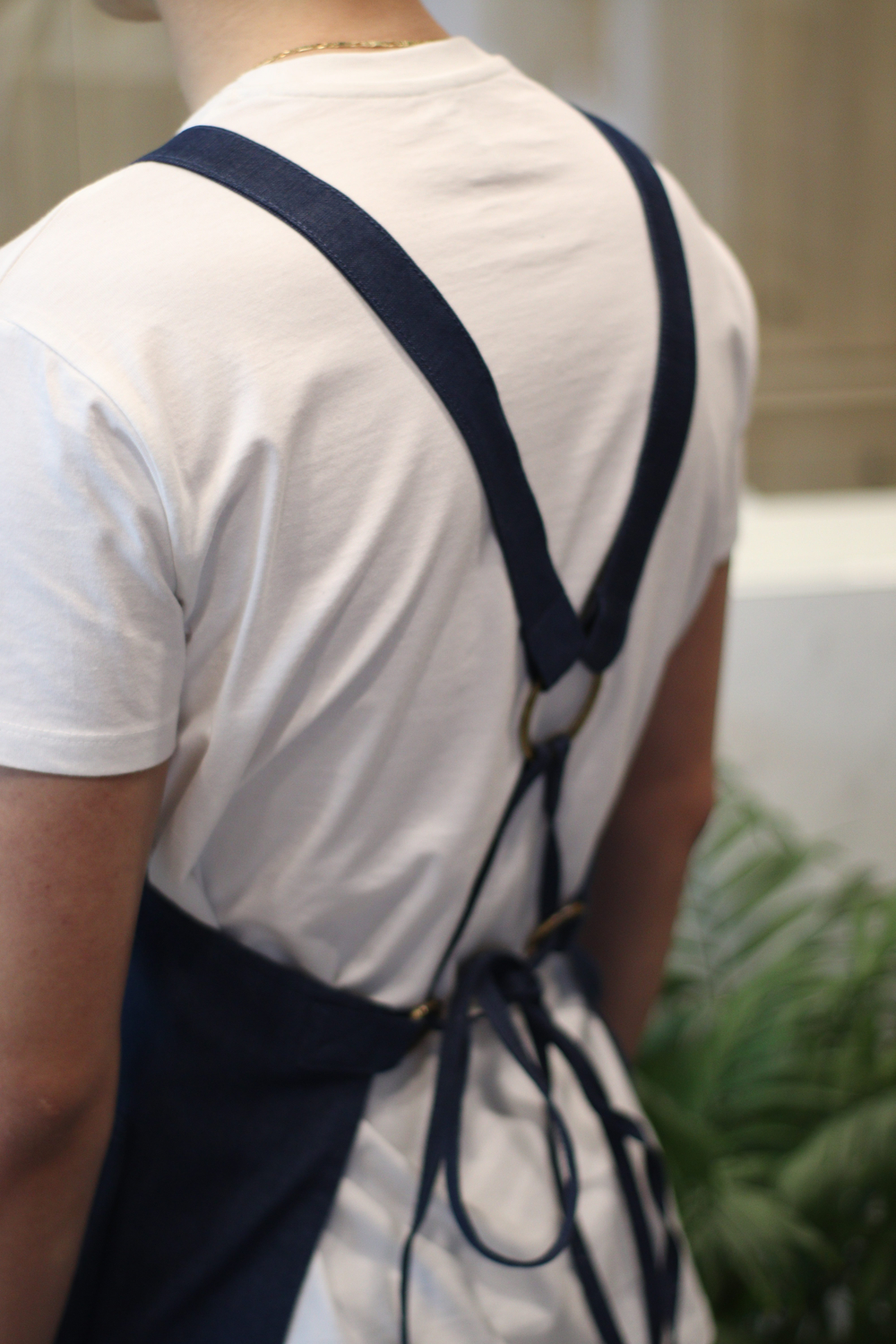 Ποδιά σε βαμβακερό τζιν με ασορτί τιράντες χιαστή πίσω που καταλήγουν σε κρίκο με δέσιμο στη μέση.