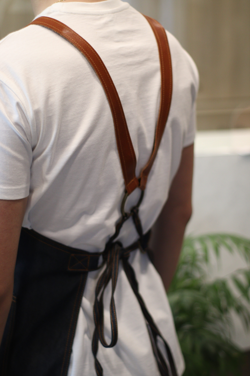 Μεγάλη τζιν τσέπη με χώρισμα και από πάνω δερμάτινη τσέπη και ασορτί τιράντες.
