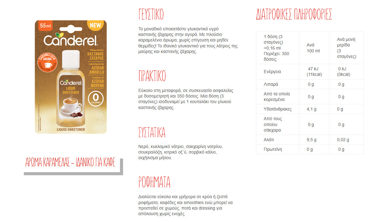 Η καστανή ζάχαρη Canderel σε υγρή μορφή προσφέρει μια γευστική και αρωματική εναλλακτική στη λευκή ζάχαρη. Είναι φτιαγμένη από κρυστάλλους ζάχαρης με χαμηλή περιεκτικότητα σε μελάσα, γεγονός που της δίνει μια πιο πλούσια γεύση. Καθώς έχει μεγαλύτερο κόκκο, απαιτεί λίγο περισσότερο χρόνο για να διαλυθεί σε ροφήματα και γλυκά, προσθέτοντας μια μοναδική διάσταση στις συνταγές σας. Παρέχει επίσης ορισμένα θρεπτικά συστατικά, όπως ασβέστιο και φυλλικό οξύ, ενώ αποδίδει θερμίδες παρόμοιες με αυτές της λευκής ζάχαρης.